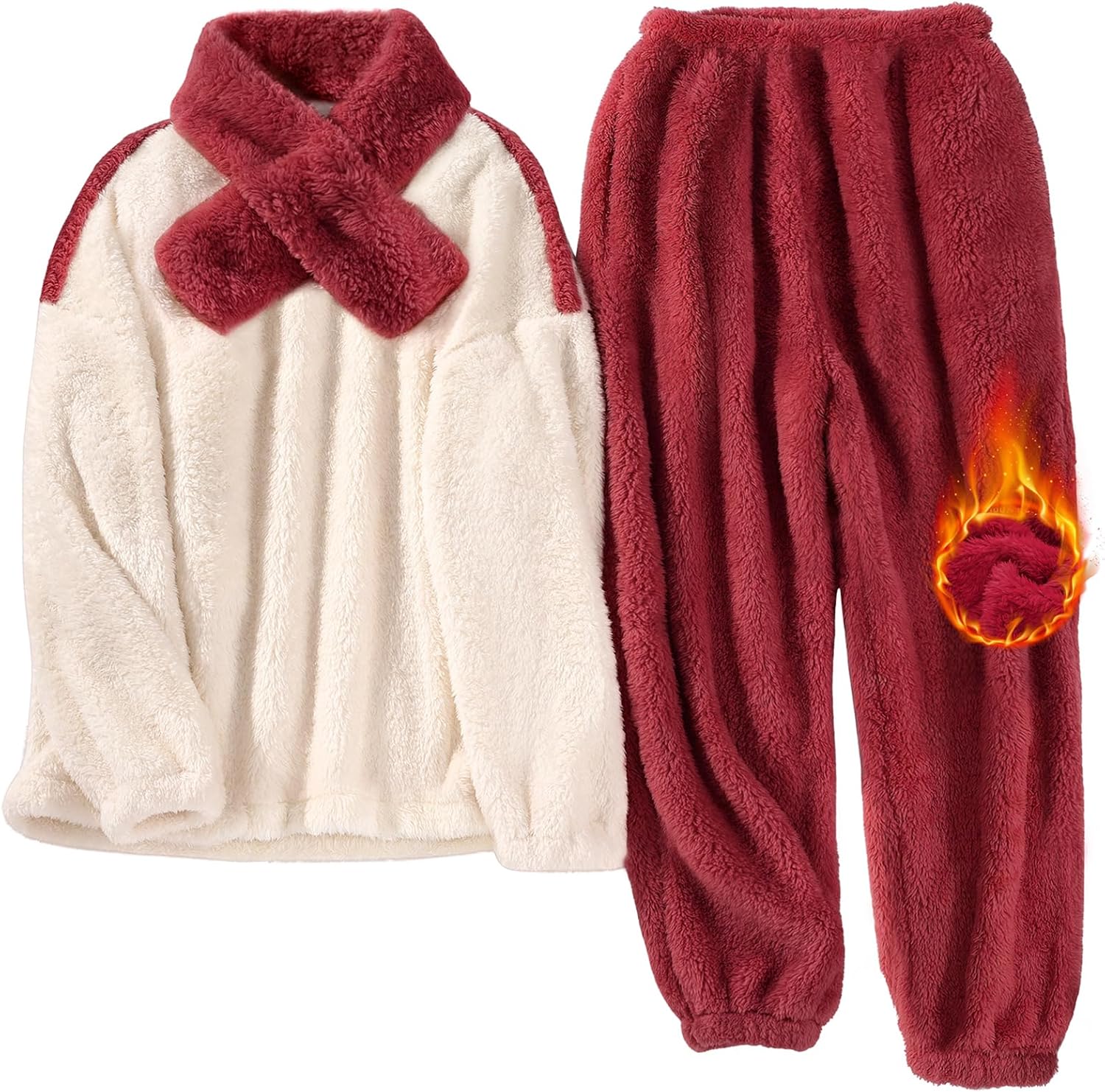 - 【2 Side Pocket Design】The pajama set are using neck scoop design to keep your neck warm, like wearing a scarf, effectively block cold wind. And the pullover fleece top makes it easier to put on/ off. Long pants with elasticated waistband fits you perfectly, and 2 pockets design can keep your hands warm.